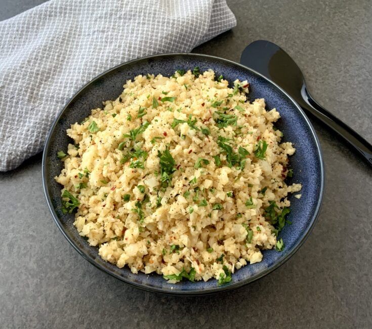 Garlic Parmesan Cauliflower Rice rice is my new favorite side dish! I had never been a fan of cauliflower prior to going low carb – I always picked around it in the mixed veggies. This particular dish is loaded with flavour and packs a smidge of heat – feel free to increase or decrease the chili pepper flakes.