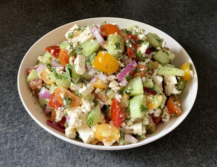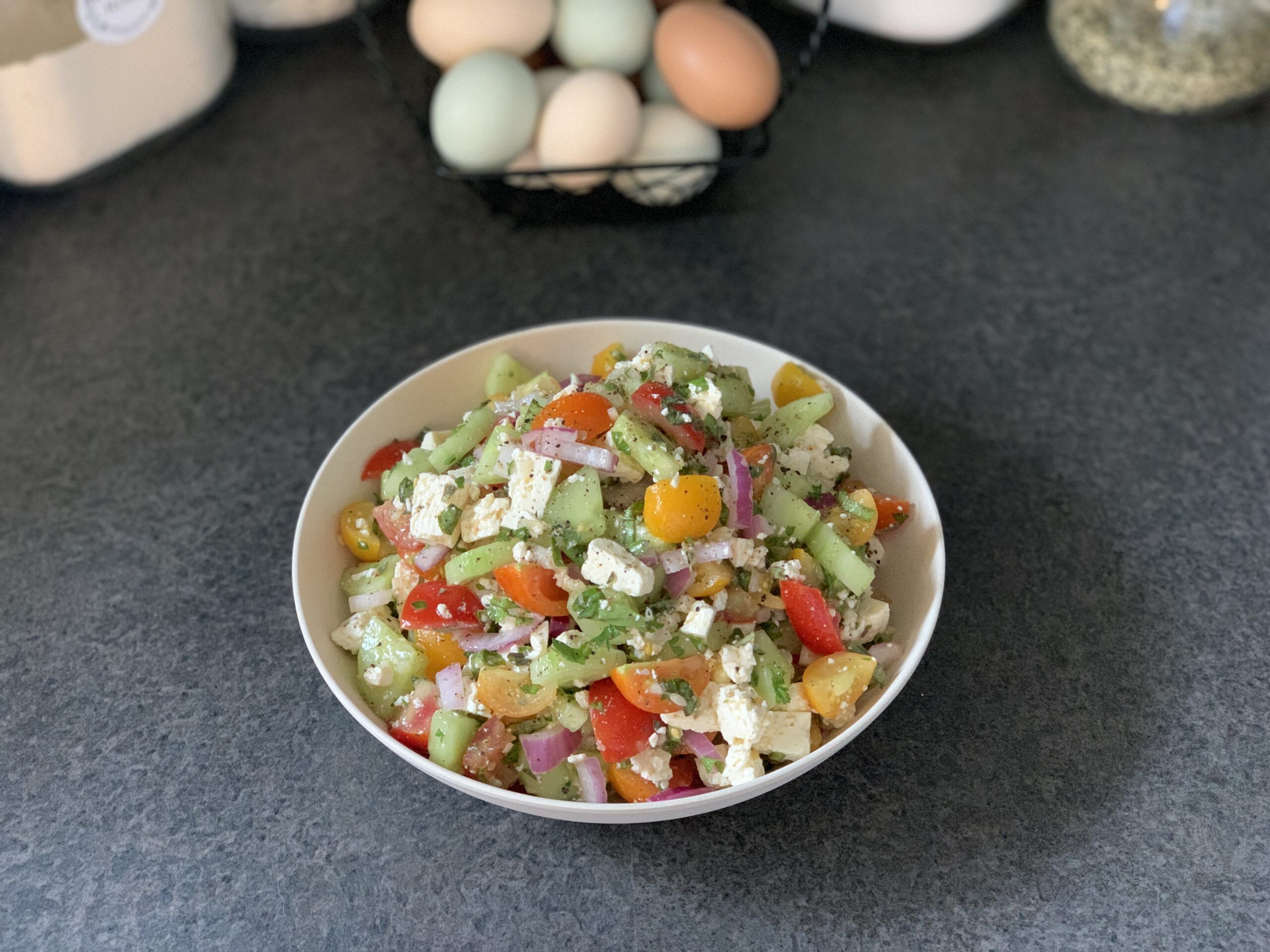 Summer BBQ’s and tasty salads go hand-in-hand and this Low Carb Greek Cucumber Feta Salad has always been mostly keto. We’ve updated the dressing with healthy fat instead of inflammatory canola/vegetable oils. The amounts of veggies are flexible and can be adjusted based on what you have. When your garden is producing tomatoes and cucumbers like crazy, this is a good recipe to keep handy. Feel free to substitute fresh herbs if you have them, you won’t be disappointed!